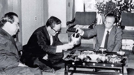 1979년 추석 이틀 뒤인 10월 6일 박정희 대통령(오른쪽)이 경북 구미에서 성묘를 한 뒤 생가를 방문해 막걸리를 들고 있다. 왼쪽부터 차지철 경호실장, 김계원 비서실장. 사진 김종필 전 총리 비서실